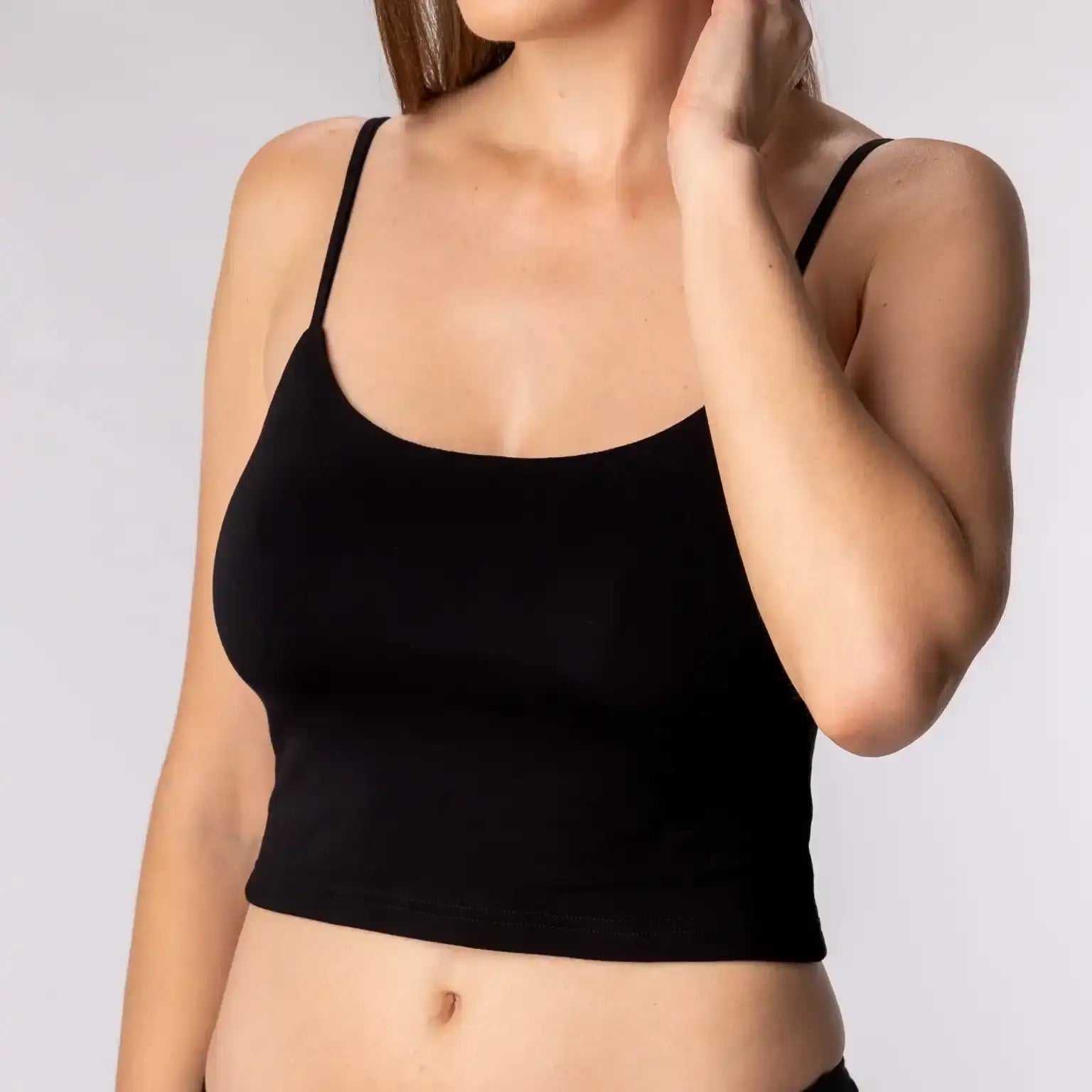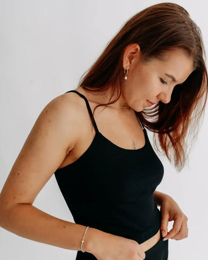 Úzká ramínka a kulatý výstřih podtrhnou tvoji přirozenou ženskost, aniž by rušily. A protože je z bambusu, můžeš se spolehnout na celodenní komfort – croptop dýchá s tebou, odvádí vlhkost a je jemné i k té nejcitlivější pokožce.